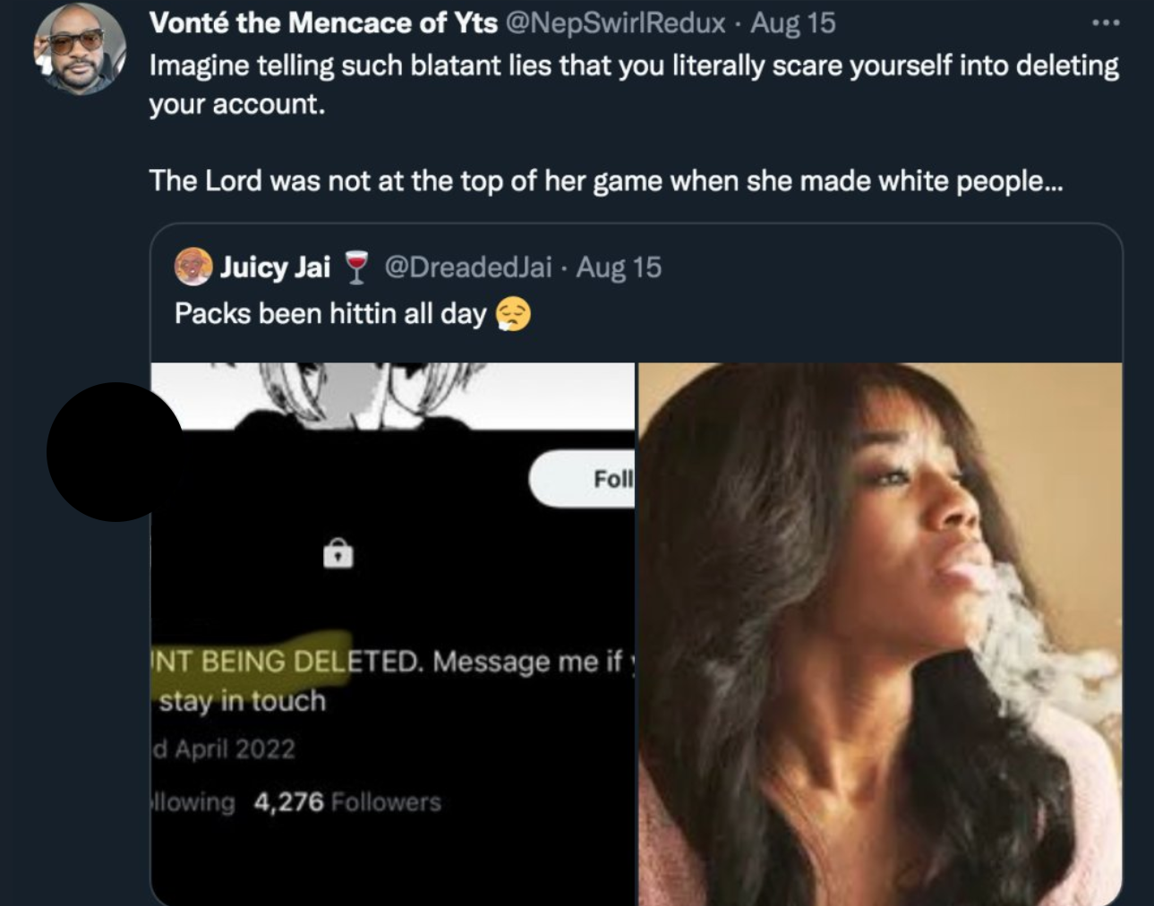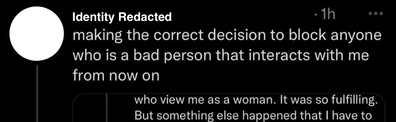 Jai was involved in beef with a white trans woman1, which had resulted in blocks. That same woman posted about her sexual assault, and received a rude reply from an unrelated third party attempting to minimize the assault.